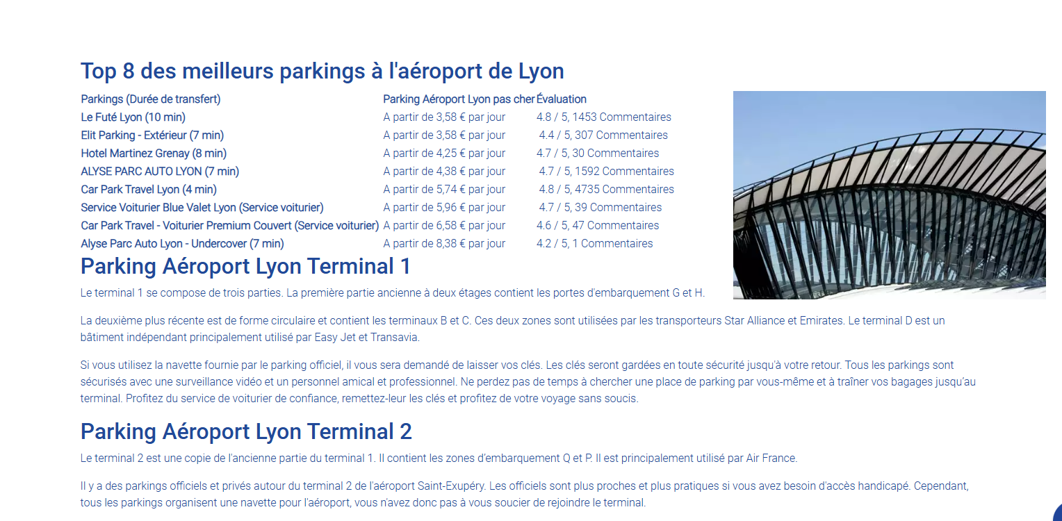 This article, "Parking Aéroport Lyon Terminal 1," is an example of my web content work in French, written for a client through Upwork. It was based on a detailed brief that included specific keywords and requirements. The content provides practical information about parking options, services, and accessibility at Lyon-Saint Exupéry Airport, as well as a brief history of the airport.