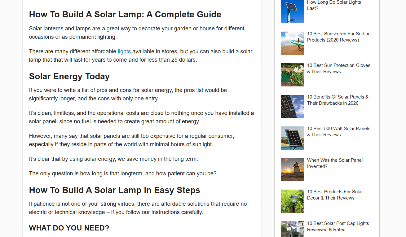 This article, "How to Build a Solar Lamp: A Complete Guide," was one of my first commissioned projects on Upwork. I conducted all the research independently, reading various manuals and learning about solar lamp construction from scratch to create a comprehensive and practical guide. The article is designed for a DIY audience and walks readers through every step of the process, from gathering materials to assembling and maintaining a functional solar lamp.