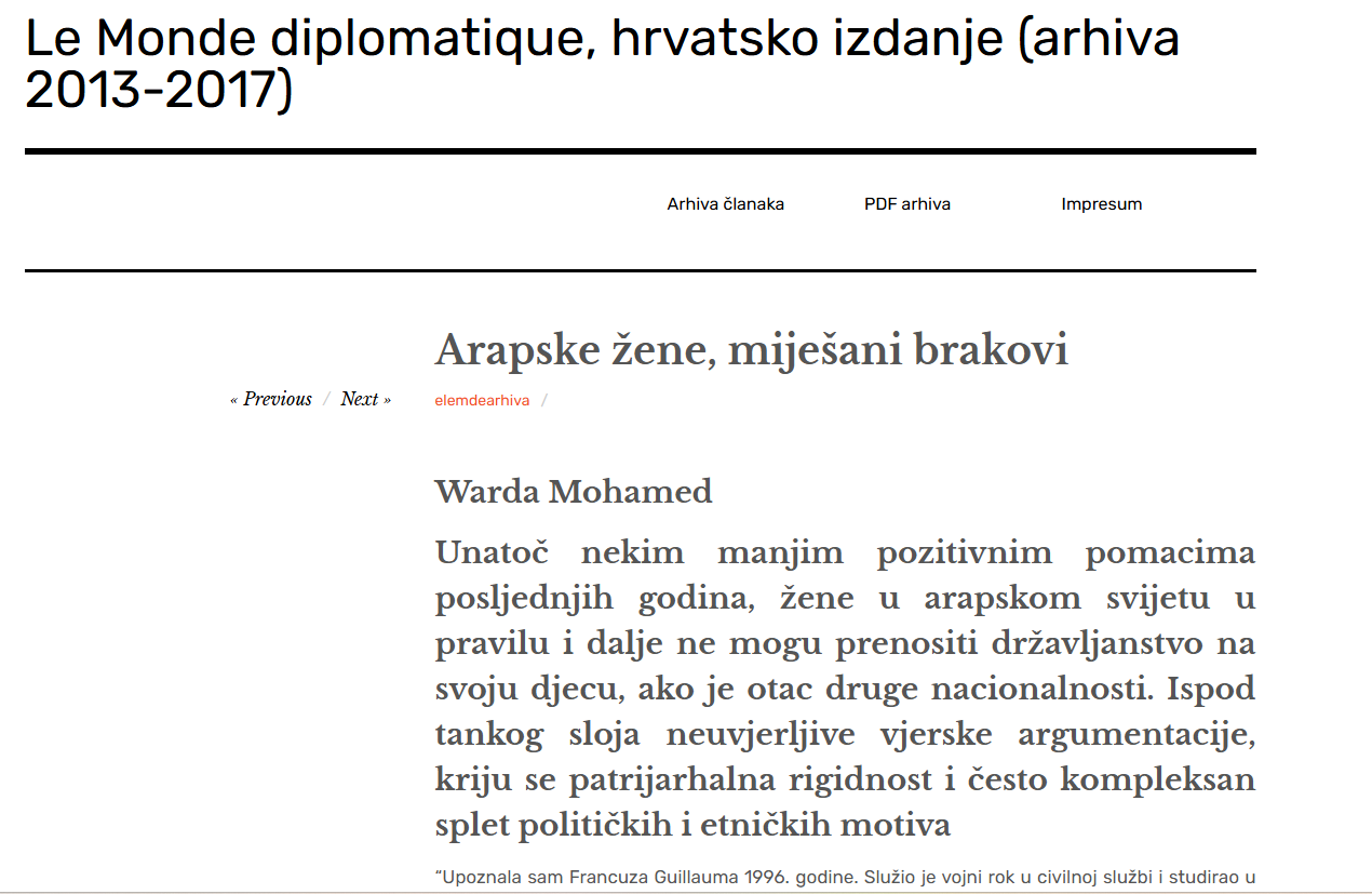 This article, written by Warda Mohamed and originally published in the French edition of Le Monde Diplomatique in January 2014, is one of a dozen I translated from French to Croatian for the Croatian edition of the publication. The original article, titled "Femmes arabes, l’égalité bafouée", examines the discriminatory nationality laws in Arab countries, particularly the inability of women to pass their citizenship to their children if married to a foreigner.